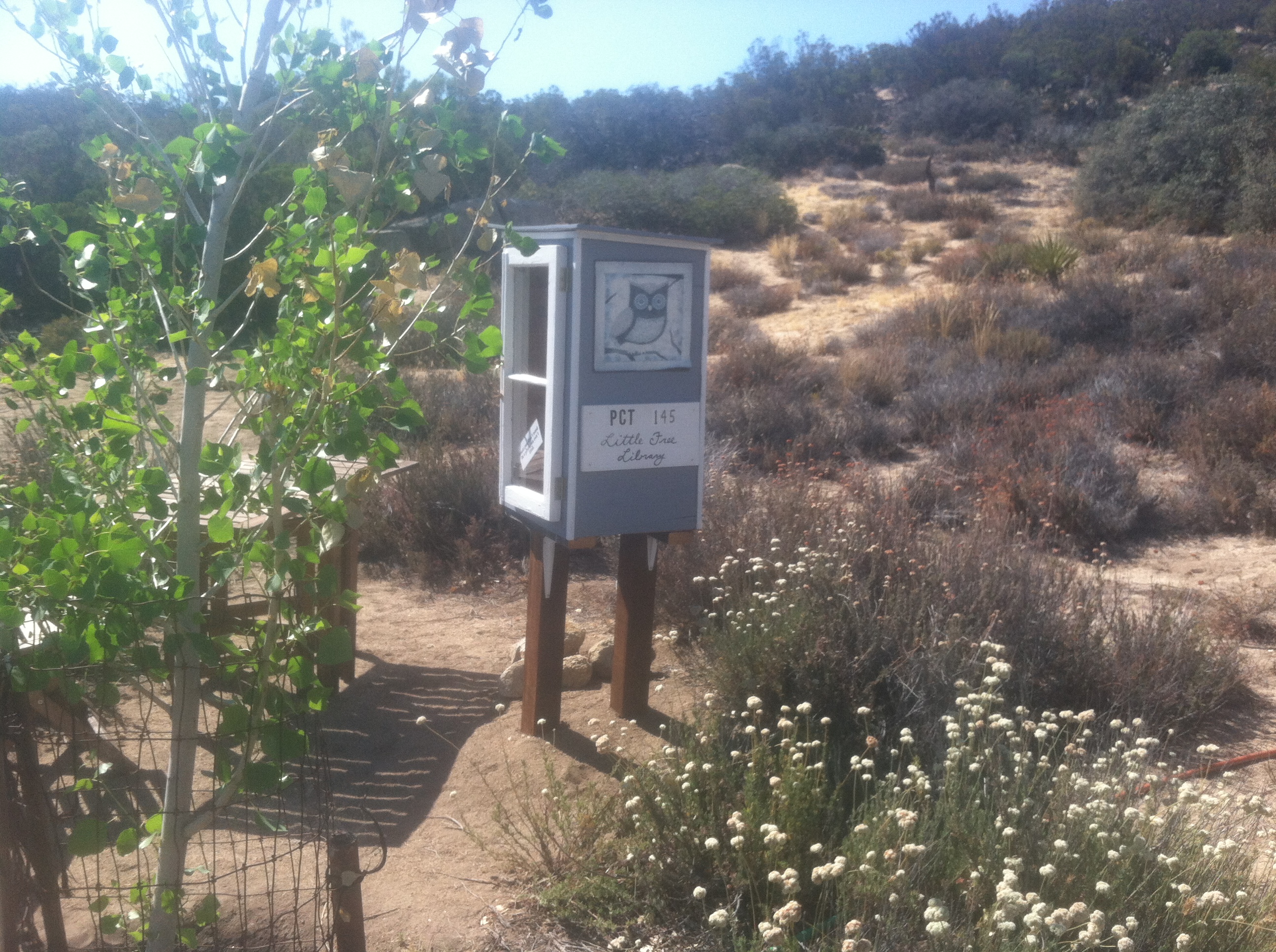 So, I bought some construction supplies at my local Home Depot and created my very own little free library. I christened it “PCT 145 Little Free Library” with the tagline “Books you don’t need in a place you can’t find” and got it registered with the LFL organization. It can be found on their “Map a Library” page if you search for it. (It is easiest to locate quickly if you search for Steward’s Name = PCT.) I initially stocked it with paperbacks I bought at a book sale held by my local library. In the meantime, I’ve come up with an alternate way to stock it with books that might be more relevant to PCT hikers.