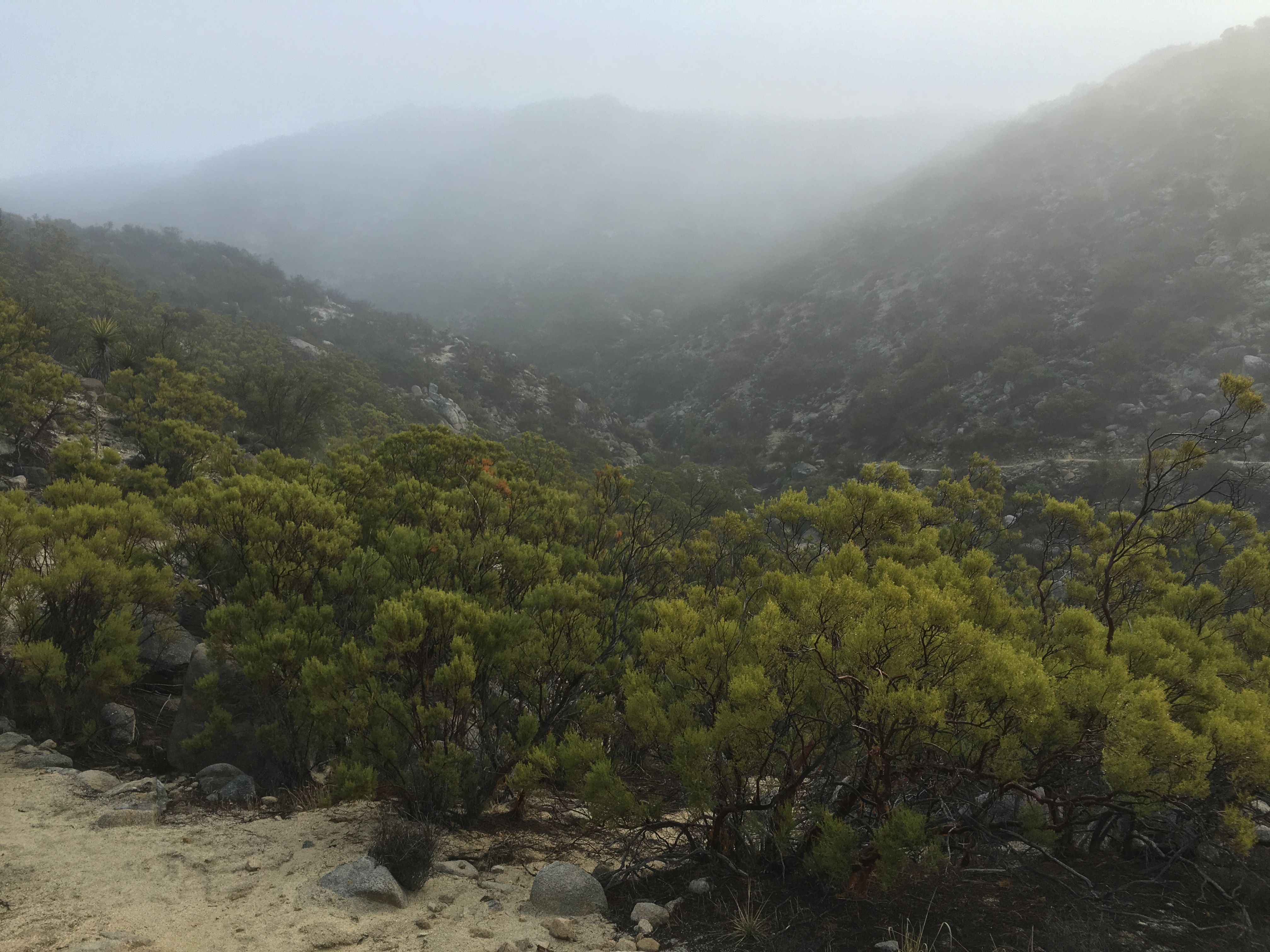 I left just as a heavy fog was lifting. I got a nice shot of an unnamed side canyon on Table Mountain (mile 144.3) with some fog still clinging to the mountainside.