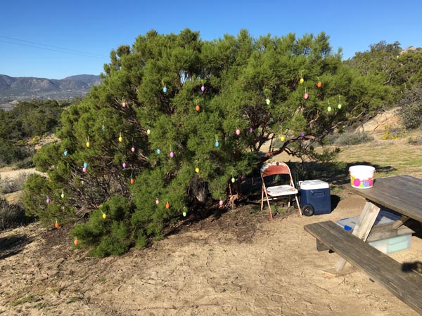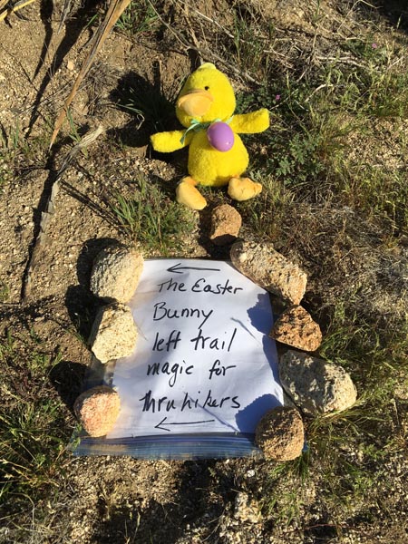 The Easter Bunny appeared at PCT 145.37 at some point between 9pm last night and 10am this morning. Some fresh fruit (strawberries, blackberries, bananas) appeared in the soda cooler, and the redshank near the picnic tables was festooned with Easter eggs for hungry hikers.