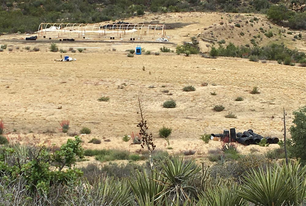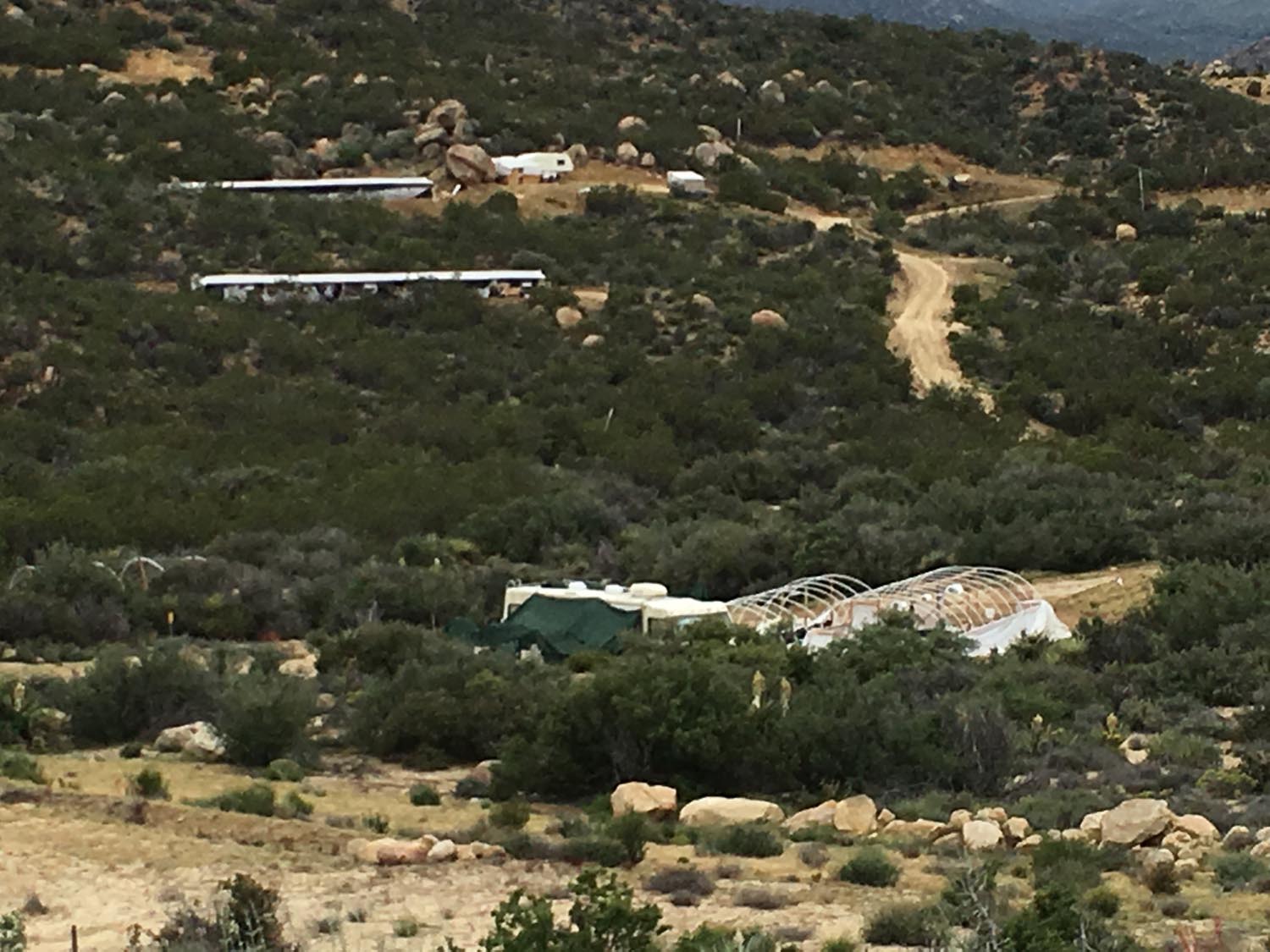 After a large drug enforcement operation nearby 10 days ago, I had my first opportunity to take a close-up look (from the PCT, of course) of the area. It is so sad, seeing what the pot growers have done (and continue to do) to the segment of this wonderful trail in Anza. While the plants and the pot growers were gone (well, not quite — they were there removing appliances from one of their RVs while I watched from the trail), the RVs and grow houses still stand next to the trail. The plastic has been partially pulled away and is starting to break away from the frames. Soon enough, it will break totally free and become yet more trash that the pot growers have “contributed” to the area.