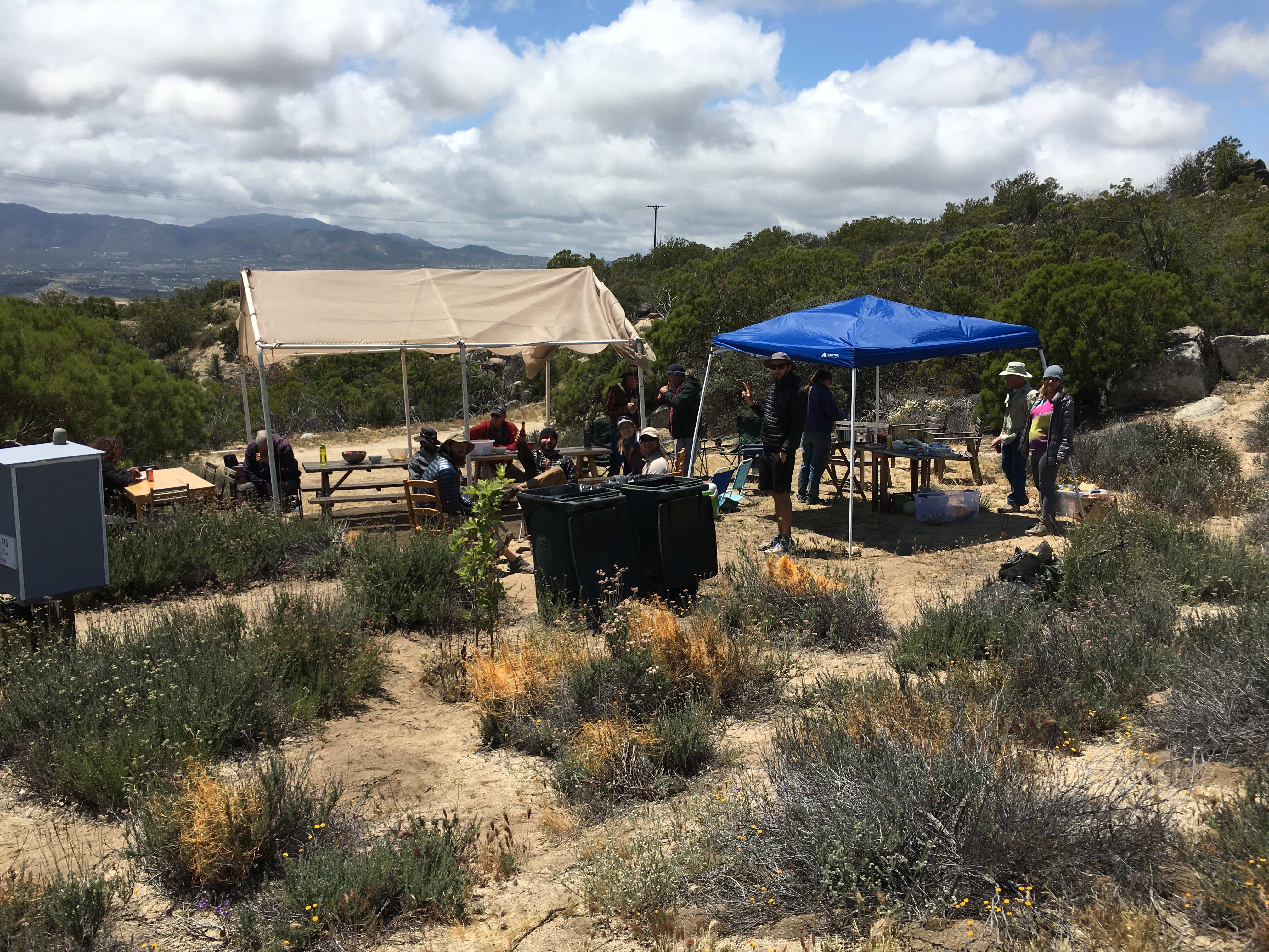 Carl and Don were left in charge of raising the big canopy tent and I started shuttling furniture and food from my house to the venue along the trail, with the weather improving a bit with each passing hour. Don ran down to the Anza cache to place a sign informing hikers of the free lunch just up the trail. By 11:30, the threat of rain had passed, and we were left with an overcast sky and chilly temperatures, but otherwise good conditions.