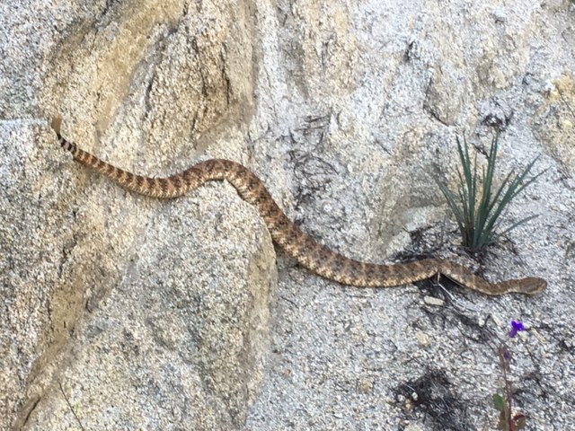 First rattlesnake sighting of the year On April 24, 2017 By trailangelmaryIn Uncategorized Gracie and I ran into this beautiful 3 foot western rattler on the PCT just north of my place. I dismounted to get a better look and to snap this photo. Share this: Click to share on X (Opens in new window) X Click to share on Facebook (Opens in new window) Facebook Like Loading... Related