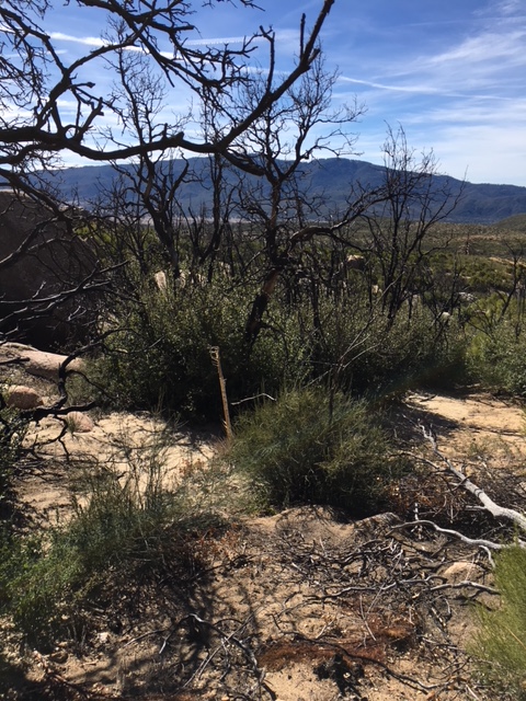Our fearless Section Chief Don led thirteen volunteers on a trail work day on the Spitler Peak Access Trail (temporarily, part of the PCT re-route around the small remaining Mountain Fire closure south of Idyllwild). On the one hand, passing through a fire area is sad, because you can see the damage that was done (and is still evident 3.5 years later). But, slowly, the vegetation is coming back.