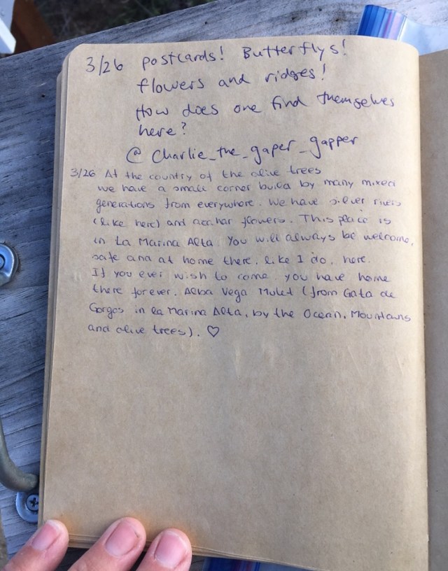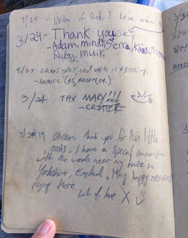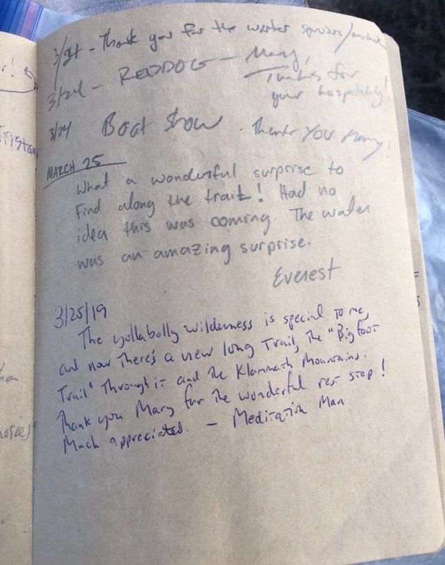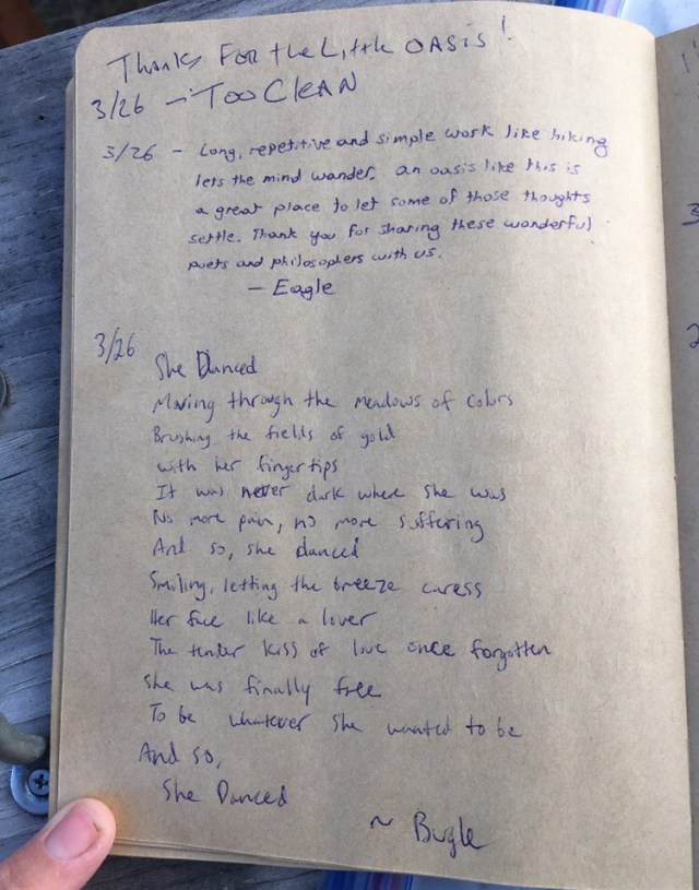 I passed through and signed the register on 3/25, and picked up the two Walt Witman excerpts — read the shorter one in my tent. As a 56 year old physics professor I just wanted to thank you for bringing thoughtful reading material to the (mostly) young PCT hikers that pass by. The trail provides quite an education but sometimes it isn’t as wholesome as it could be. Maybe we could think of a “university of the trail” with a wide-ranging curriculum of sorts. Astronomy, geology, meteorology, and ecology are well represented (but only if one pays attention) so it is essential to have the humanities as well!