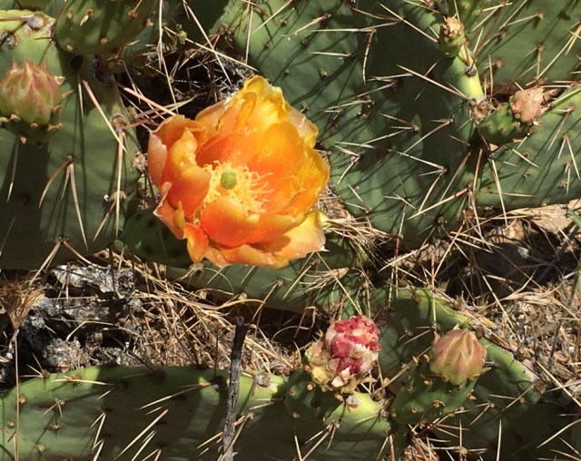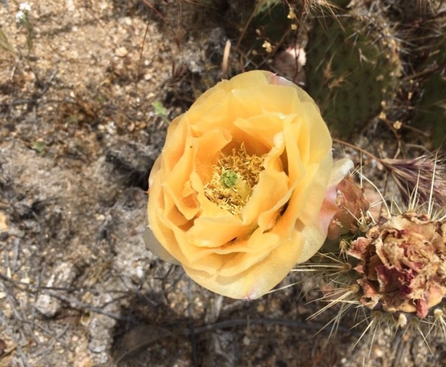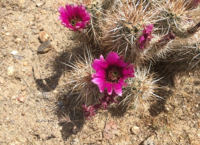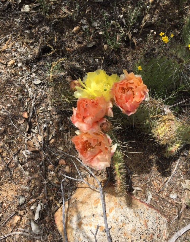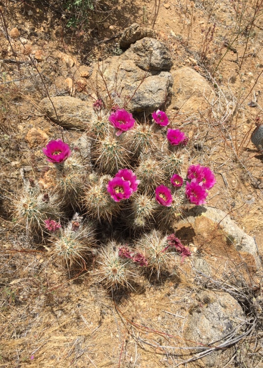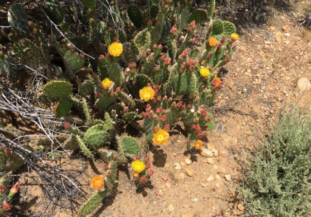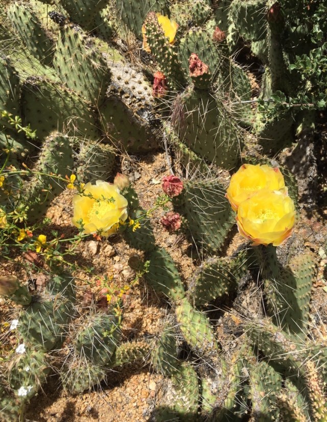 The cacti along the PCT near me are blooming. While cacti are dependable bloomers, the profusion of flowers has certainly been helped along by the large amount of rain we received this winter and spring. I always wonder that cacti (especially the species of the prickly pear cacti) are not cultivated like roses for their variety of color.