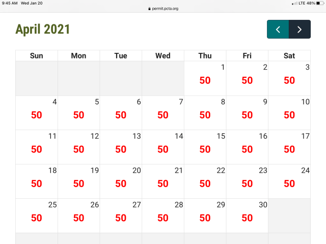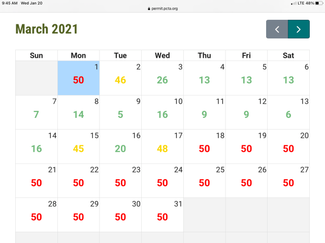Just one day after permit applications opened on the PCTA’s website, most of the days in March, April and May have reached their limit of 50 permits per day for northbound thru hiking the PCT beginning in Southern California. Uncertainties around Covid remain, but it is clear there is still significant interest in thru hiking the PCT in 2021.