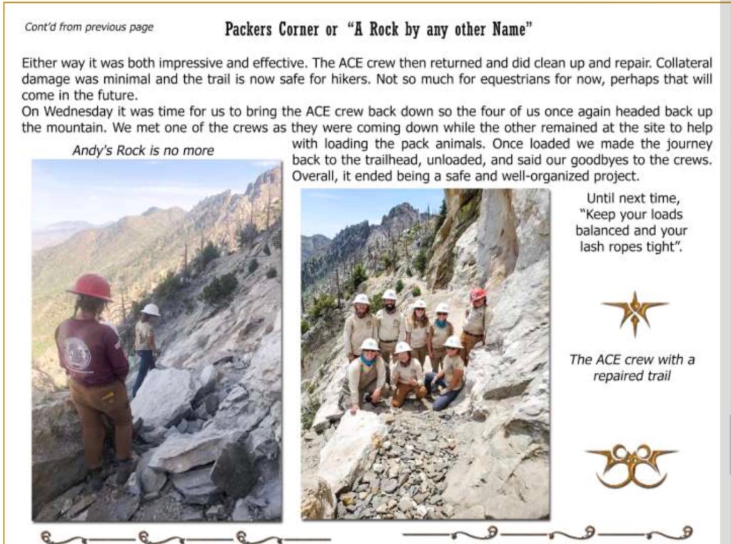 Here’s a guest post from Michael Lewis, President of Redshank Riders, the local unit of Backcountry Horsemen of California. Mike served as one of the packers assisting in removal of the rockslide at PCT mile 172.5. This article by Mike appeared in the August issue of “Tails from the Trails,” the monthly newsletter for Redshank Riders.