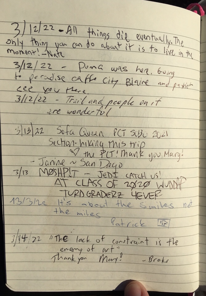 Trail Register, March 17 On March 17, 2022 By trailangelmaryIn journey-learn Share this: Click to share on X (Opens in new window) X Click to share on Facebook (Opens in new window) Facebook Like Loading... Related