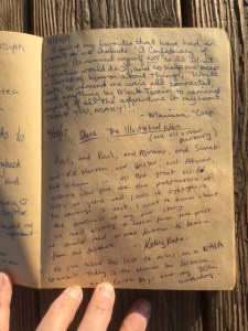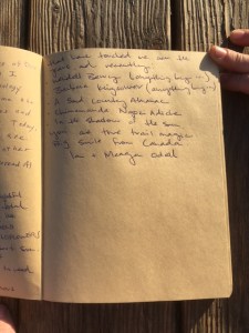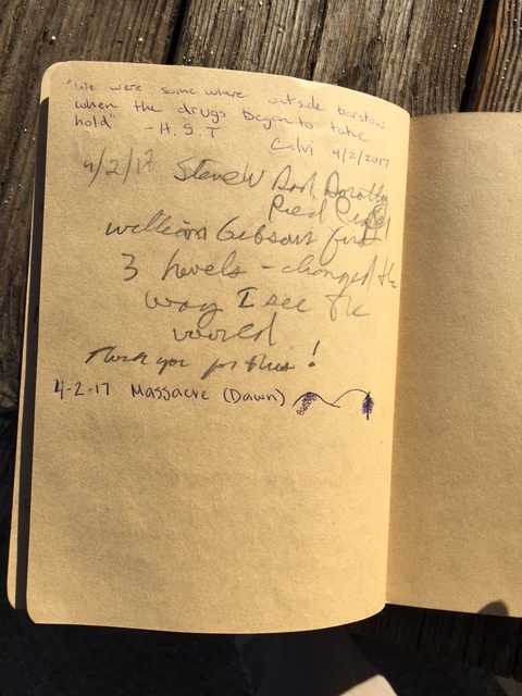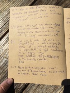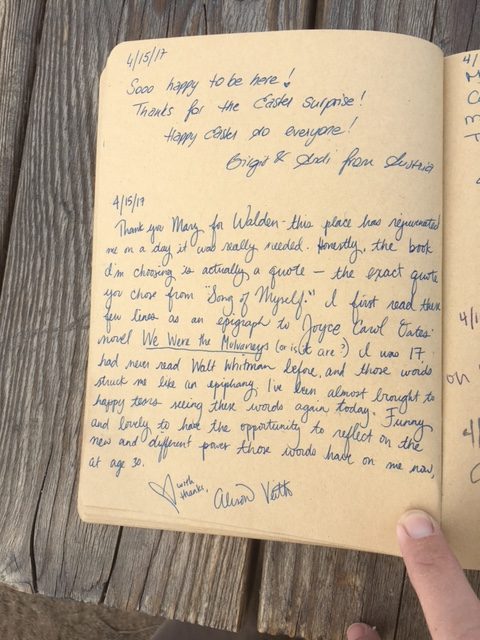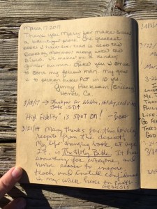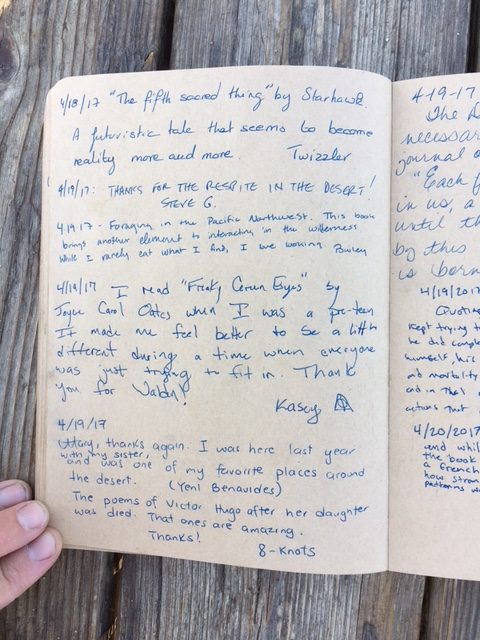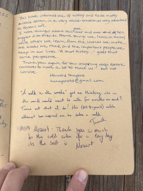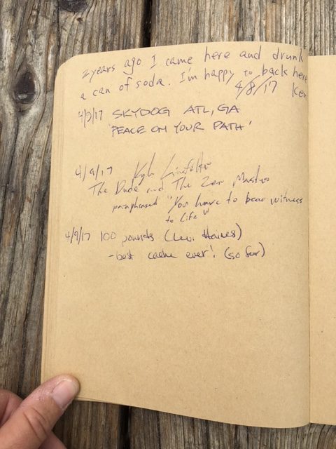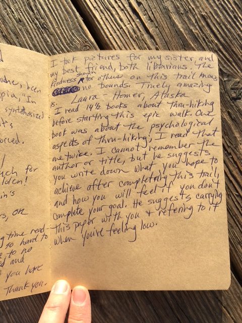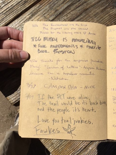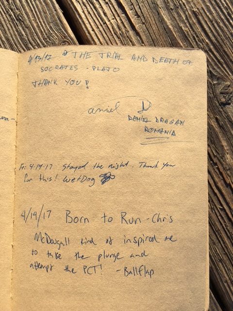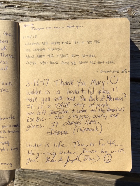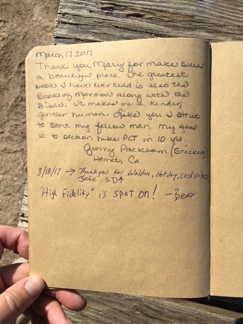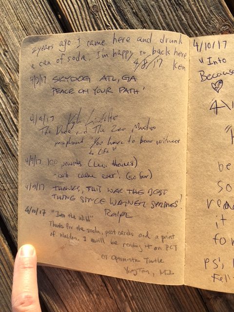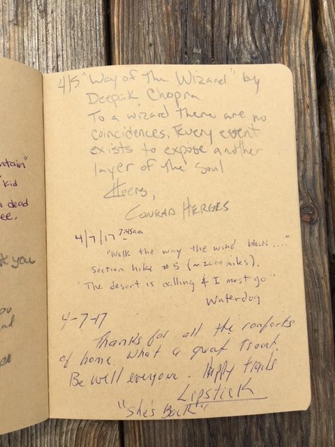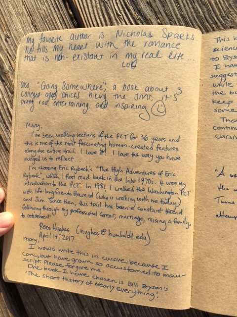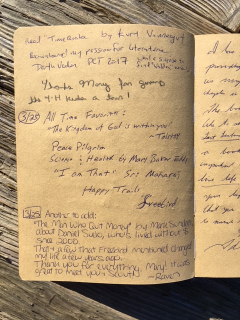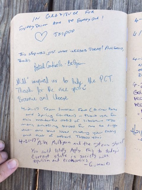 This was the first weekend with large numbers of hikers stopping by my place. I personally met about a dozen, since I hung out there for a couple hours on Saturday and Sunday, but suspect many more stopped by. Several pages in the hiker book register were filled in. Click to enlarge enough for reading.