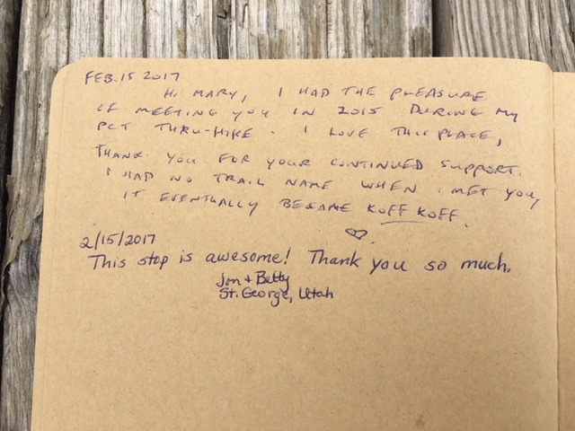 In addition to offering reading material for hikers, I have added a new twist on the trail register. This combines the “sign and date it”-type register typified by the 2016 Surfboard Trail Register with the “share your thoughts about water caches” 2015 Comments Notebook. For 2017, I am asking visitors: “Is there a book that has ‘dated a new era in your life’? Share the title and a few sentences about its significance to you in this notebook for those who come after you on their journey.”