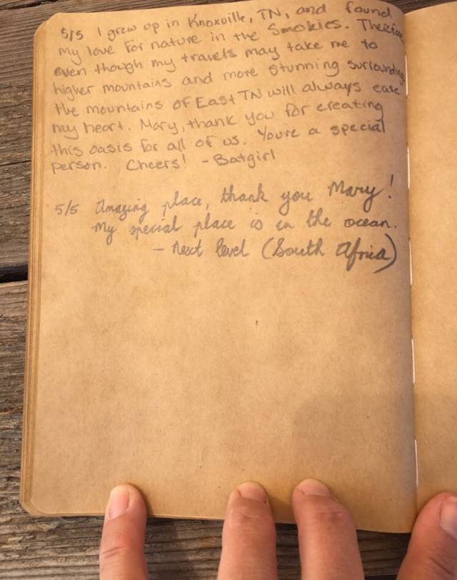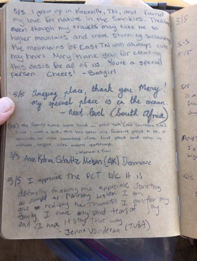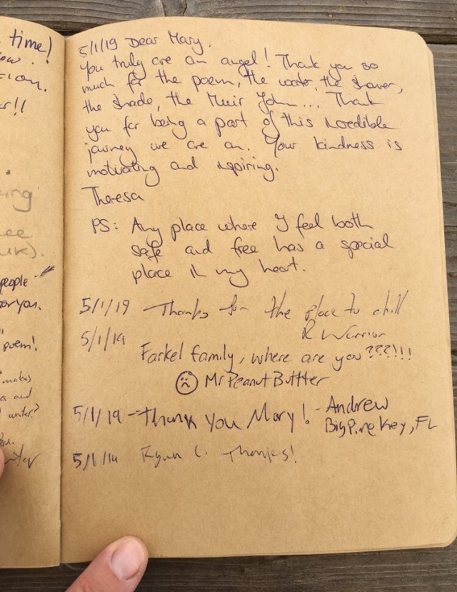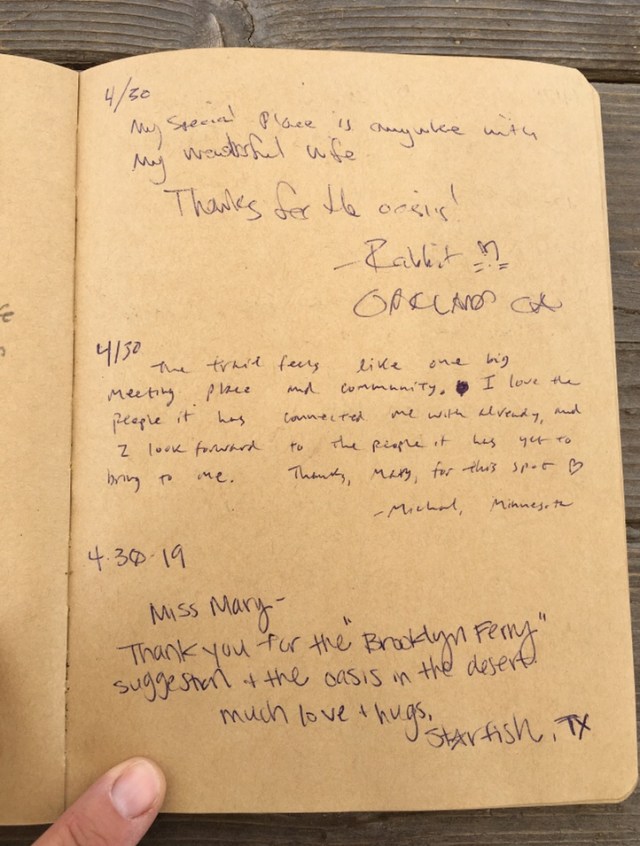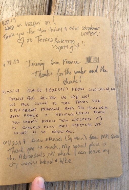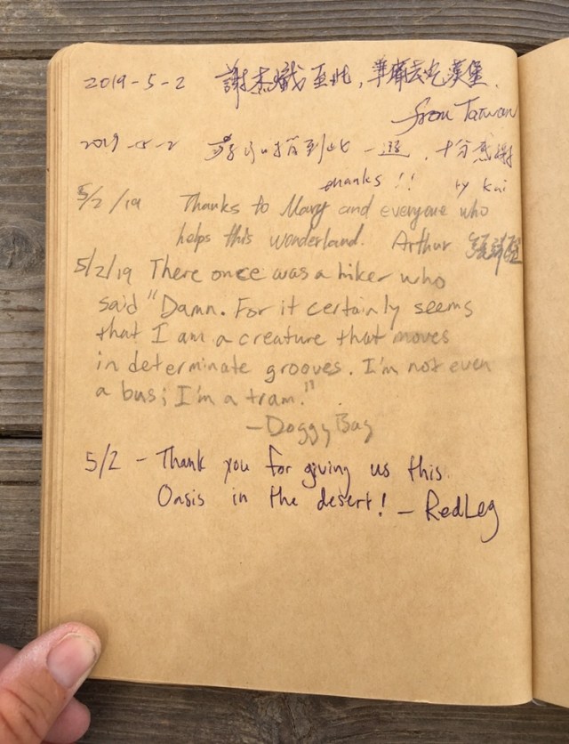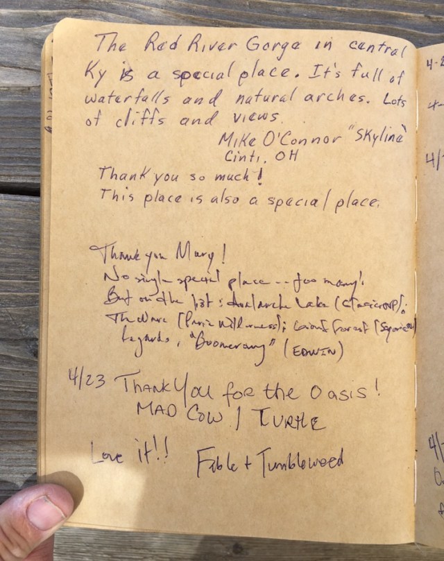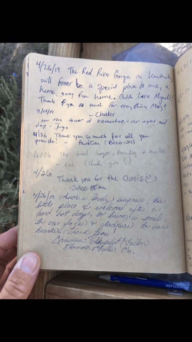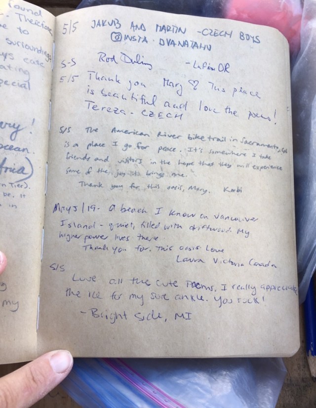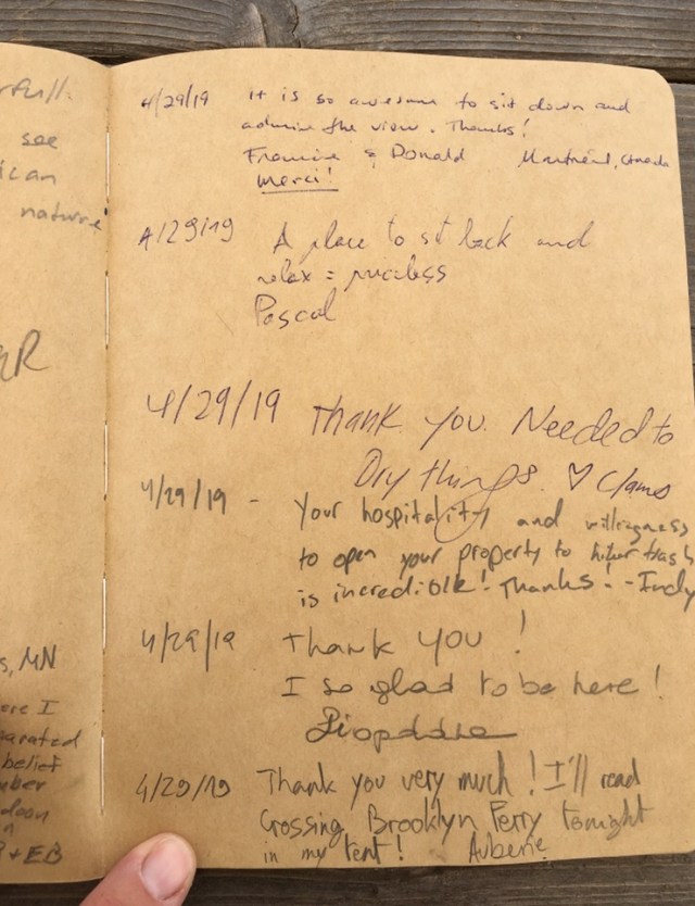 In 2019, the hiker oasis celebrated the 200th anniversary of Walt Whitman’s birth. The hiker register prompt followed a lead from Whitman’s poem “Crossing Brooklyn Ferry,” and asked hikers to describe a place that is special to them … that they feel a special connection with.