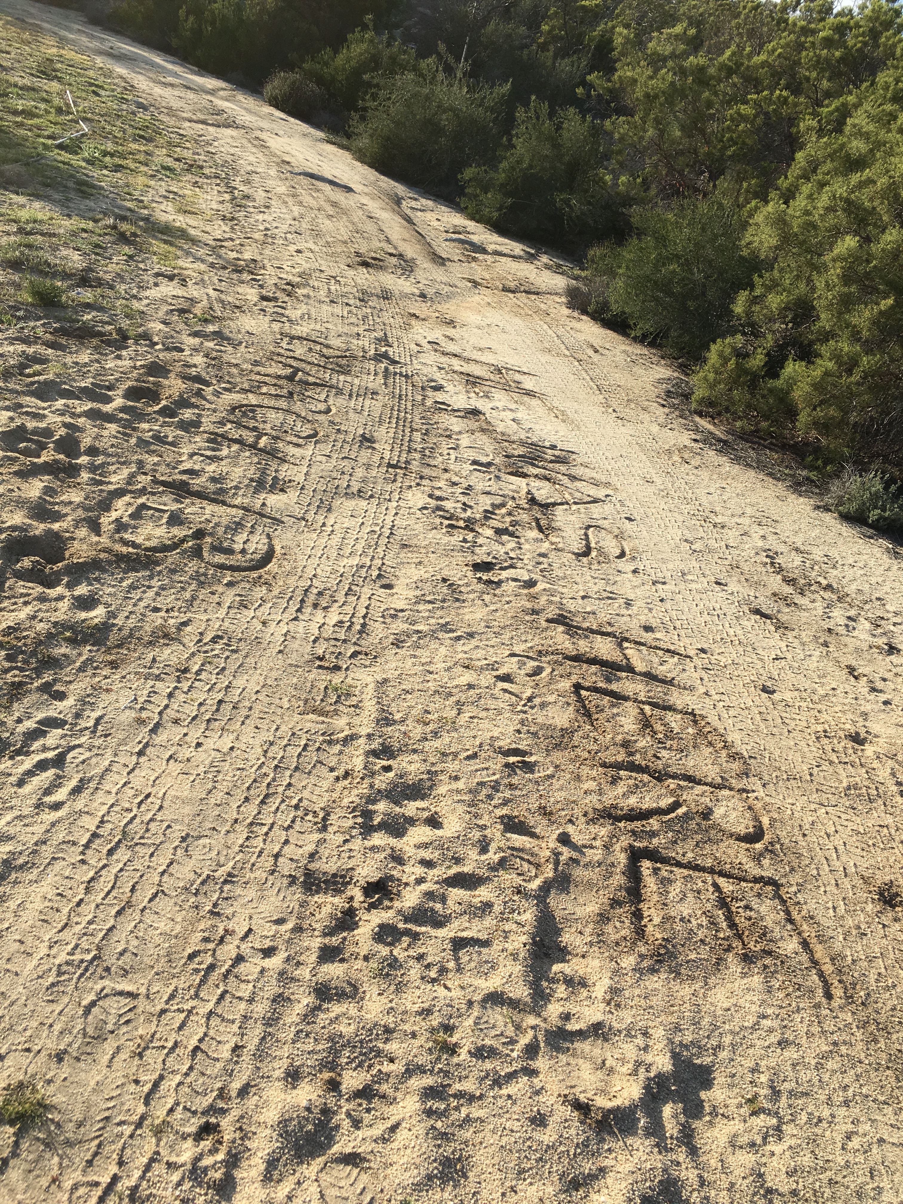 I then had two singletons stop by for a rest and a chat. Not ten minutes after the second one, “Chad,” left my place, a Riverside County helicopter came swooping down. Over the copter PA, they asked whether I was <name omitted>. When I did a thumbs-down to answer no, they flew off, trail-south. I checked my trail register, and sure enough, <name omitted> was there. He was one and the same “Chad” who I had just finished talking with. (Not sure whether “Chad” was a nickname or a trail name.) Anyway, the copter circled back and I did my best to flag them down. We tried communicating by my writing BIG on the ground. You can see one of my responses in the image to the right. When that didn’t get anywhere, I signaled for them to land so we could talk. (Keep in mind that, during all of this, my poor horse was tied to my hitching post nearby, terrified of the helicopter hovering just overhead, ready to bolt at any minute.) I showed them the signature on my trail register and we figured out that this person was “Chad” who had just left, so they took off (this time in a way so that they didn’t fly directly over Gracie) in search of the hiker. Turns out, his family had reported him missing. Luckily, this story of a missing hiker ended more happily than the missing hiker, Chris Sylvia, who disappeared in the area at about the same time last year.