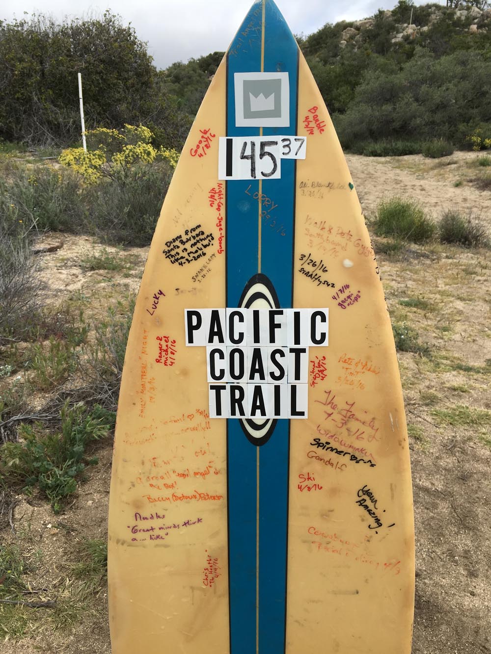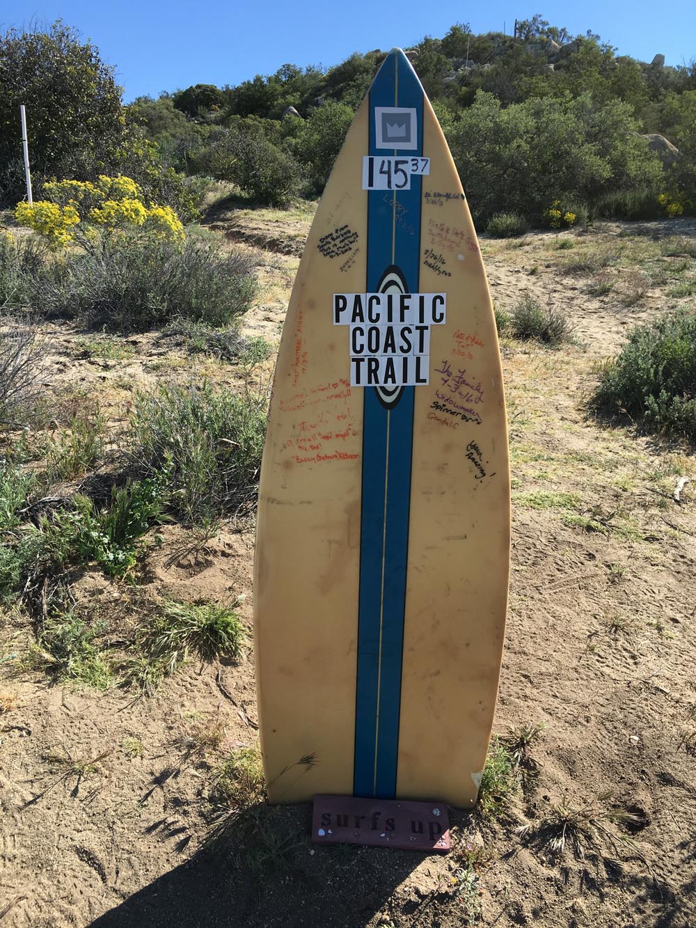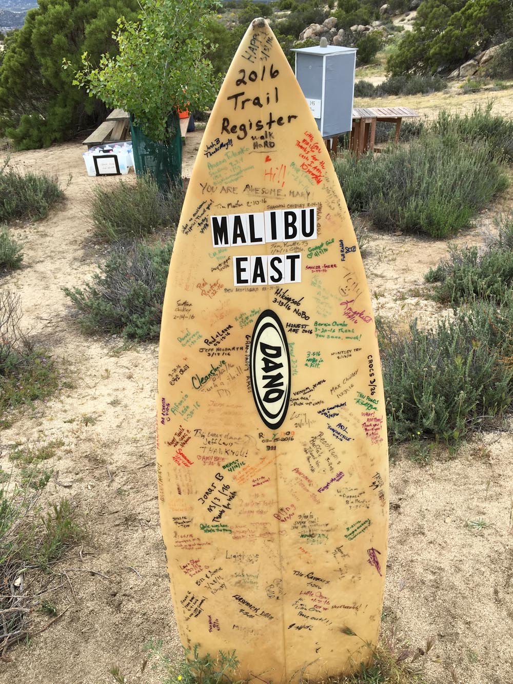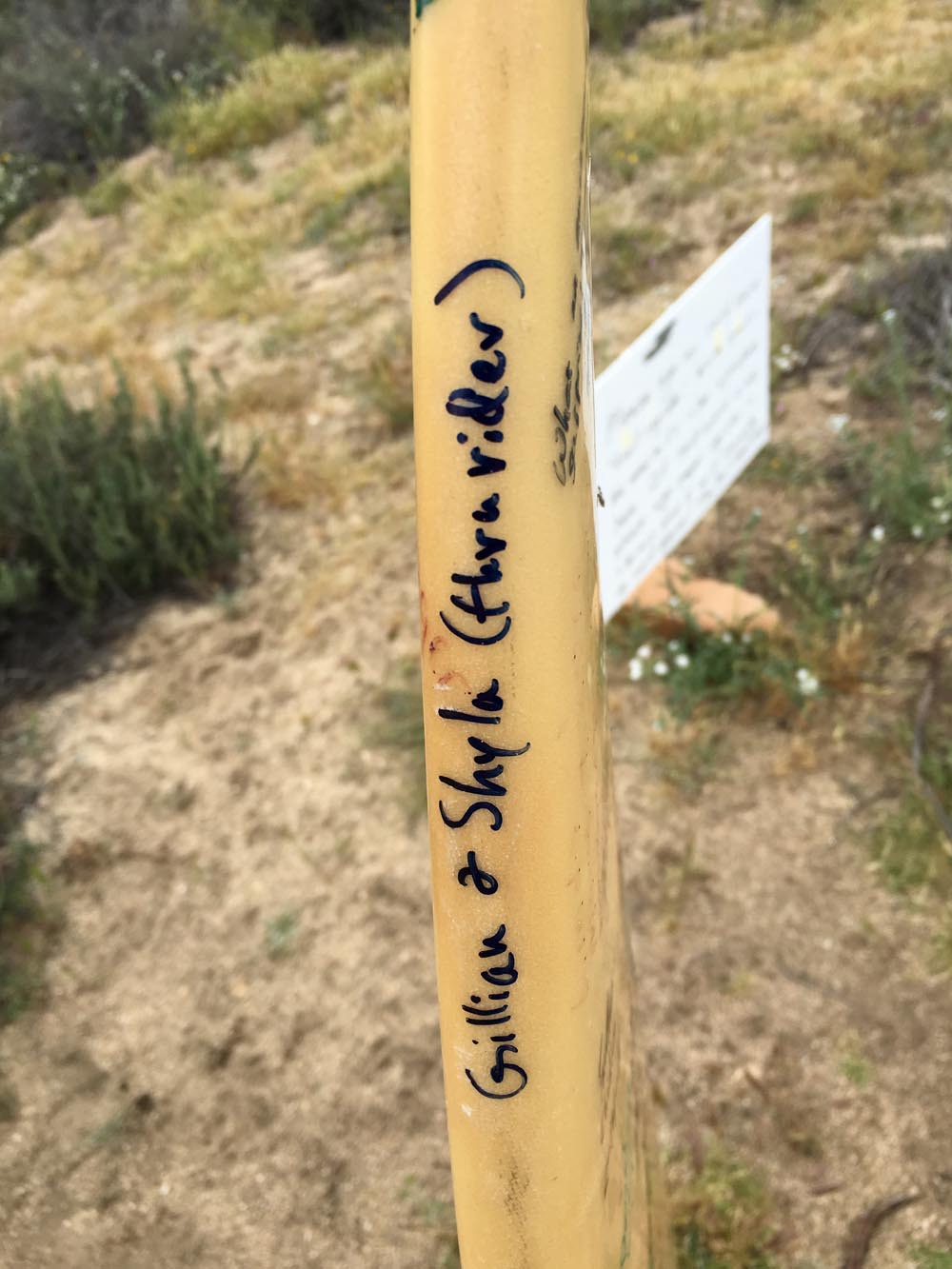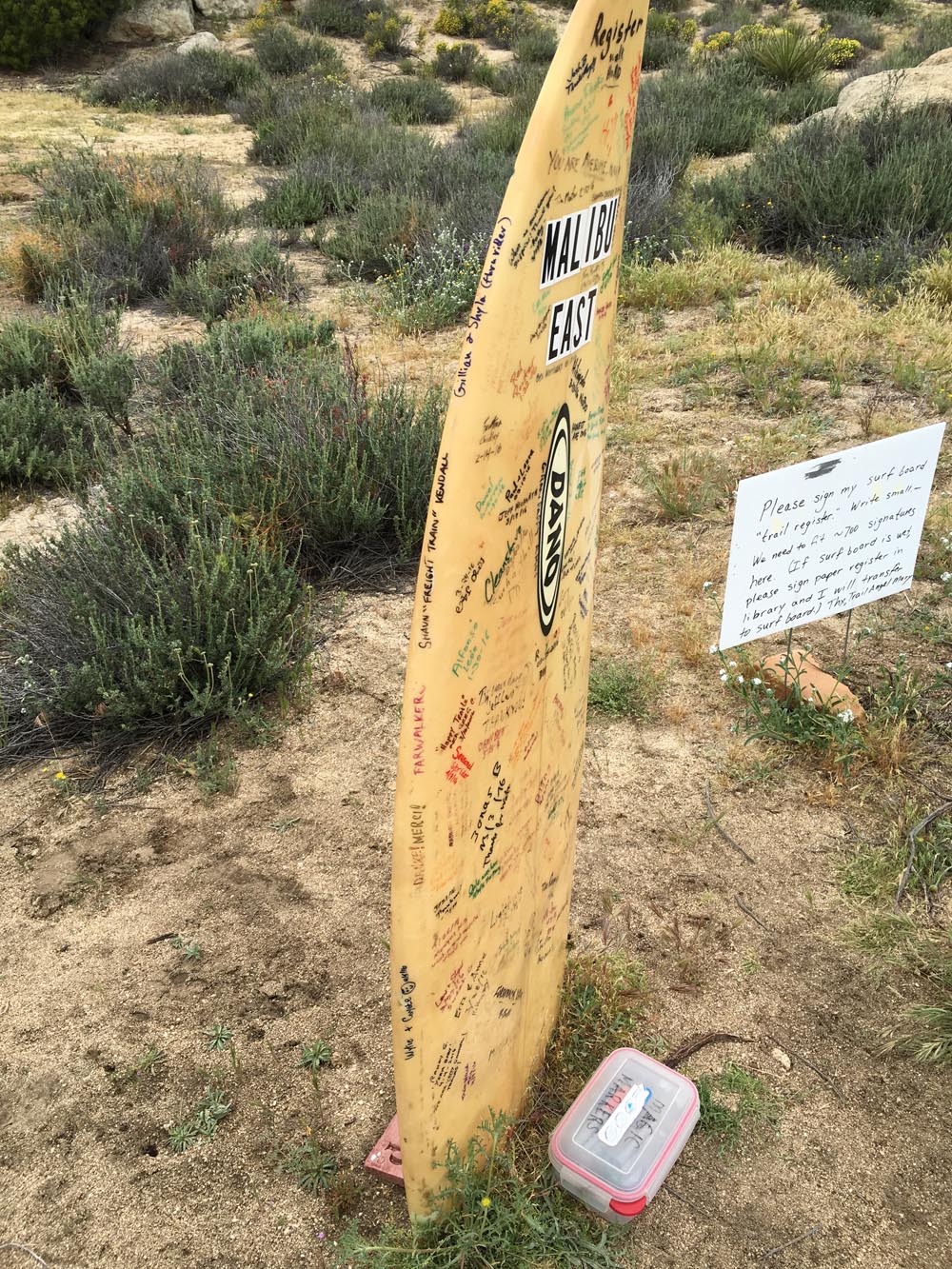 Hikers are writing too big for the many hundreds of signatures I expect this hiker season to fit on my surfboard trail register. Luckily, the permanent markers I am using are not really permanent under the desert sun. Each signature lasts for a few week: long enough for me to capture it in a photo. Then, it fades. So, I’ve decided to use regular updates of the trail register photo to document all the souls that have passed by. Here’s the most recent installment, taken Sunday afternoon. (It includes the signature of <name omitted>, the missing hiker.)