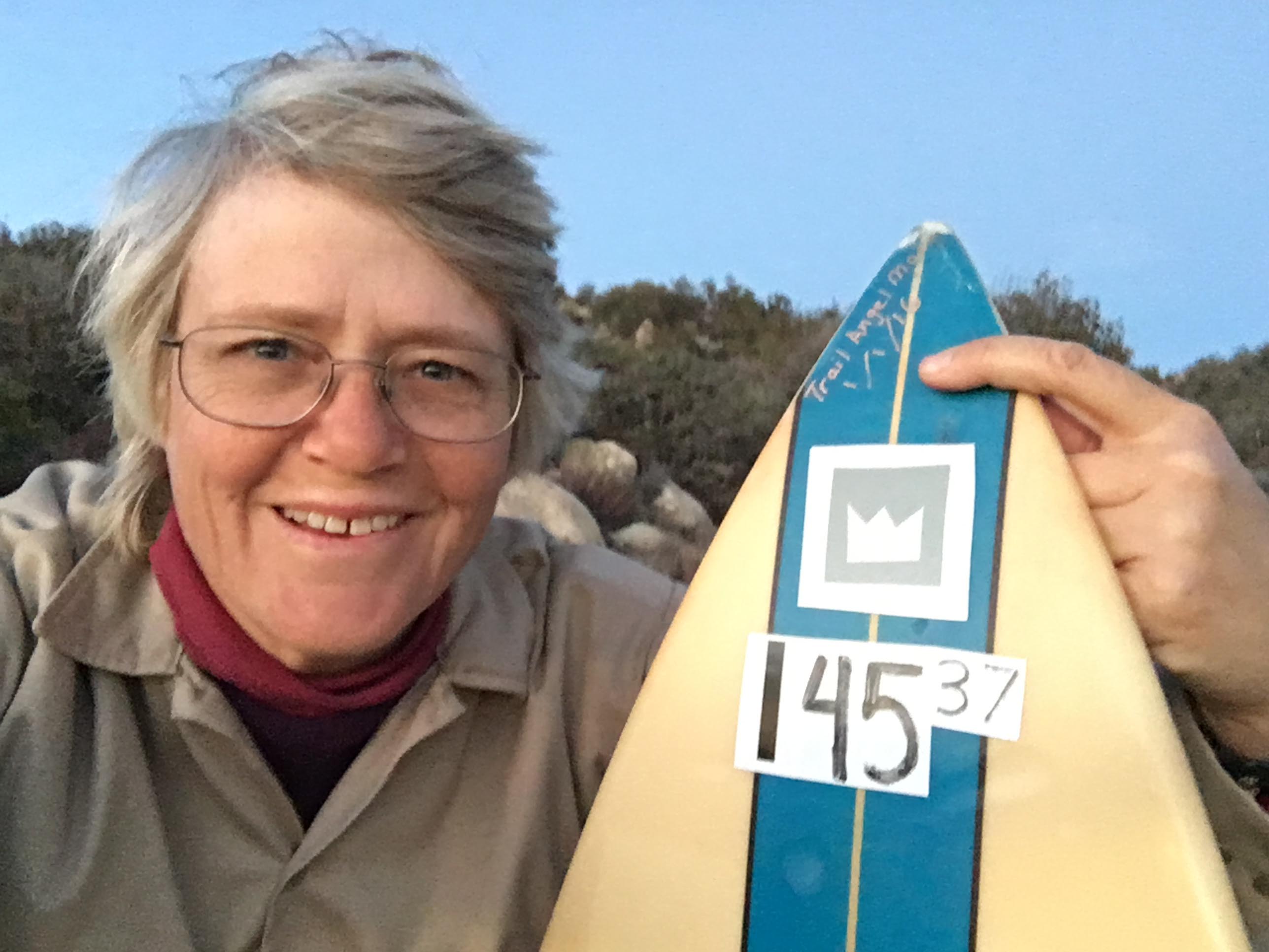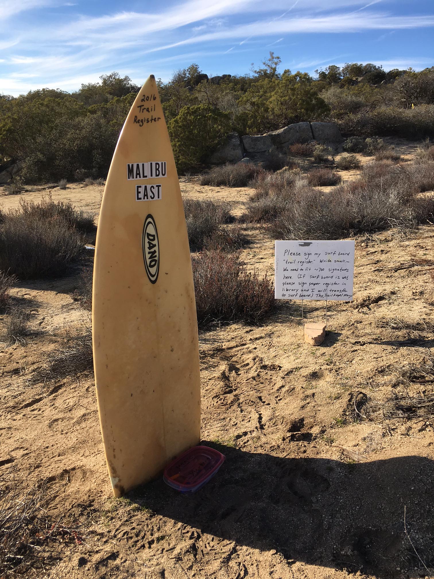 I had the bright idea of setting up a trail register for 2016 to get a better feel for the number of hikers visiting my place. Rather than have hikers sign a notebook, I thought this might be a good use for my surf board, which is holding up better than I expected in the sun, wind and snow of the desert mountains. I posted a sign with instructions for signing the register: “Please sign my surf board ‘trail register.’ Write small — we need to fit ~700 signatures here. (If surf board is wet, please sign paper register in library and I will transfer to surf board.) Thx, Trail Angel Mary”